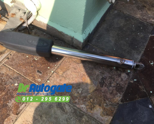 Dari gambar anda boleh tahu apa masalah autogate yang customer di Sri Hartamas, Kuala Lumpur ini hadapi dimana one side autogate arm tercabut, autogate bracket damaged punca autogate rosak customer…